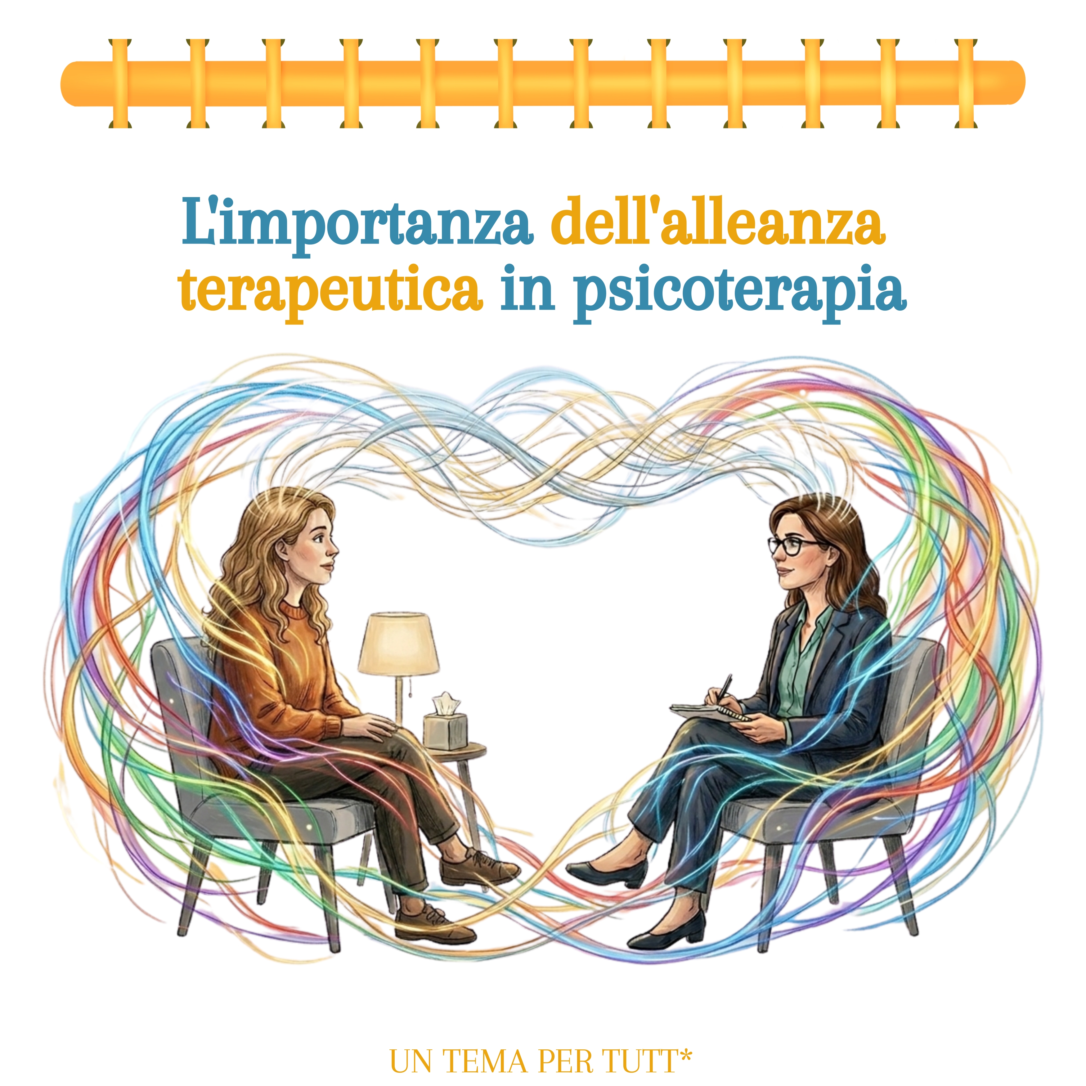 Alleanza terapeutica significa che terapeuta e paziente si riconoscono reciprocamente nei loro rispettivi ruoli, all'interno di un setting predefinito, in funzione di uno scopo condiviso.